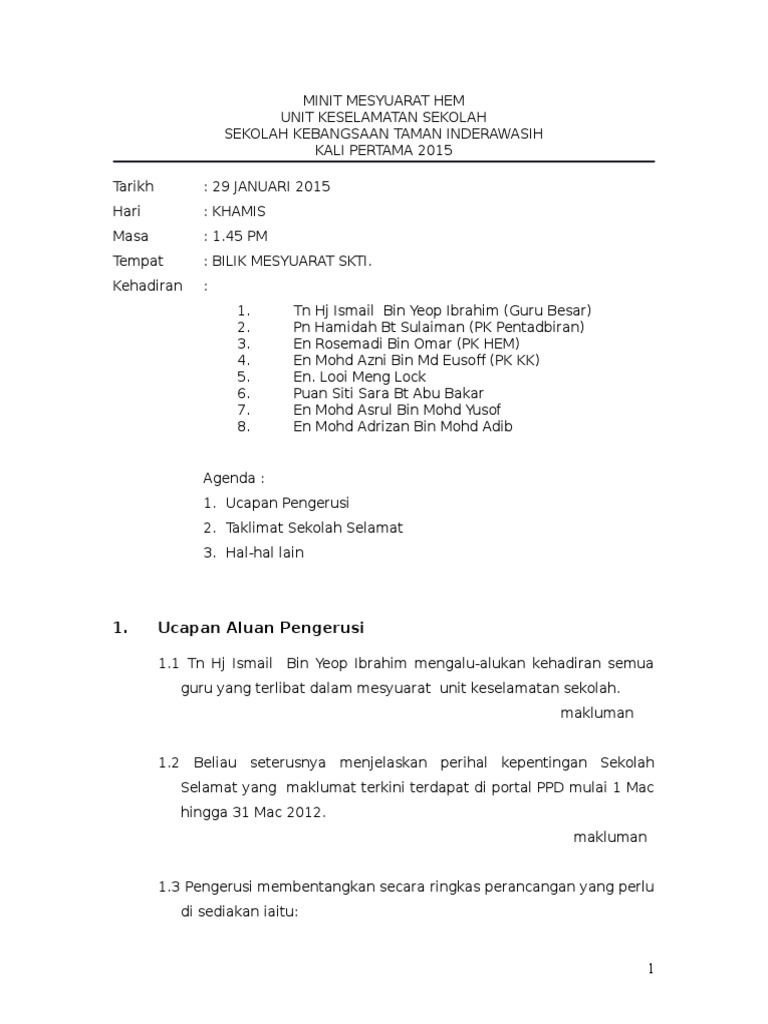 Minit Mesyuarat Keselamatan Sekolah Pdf